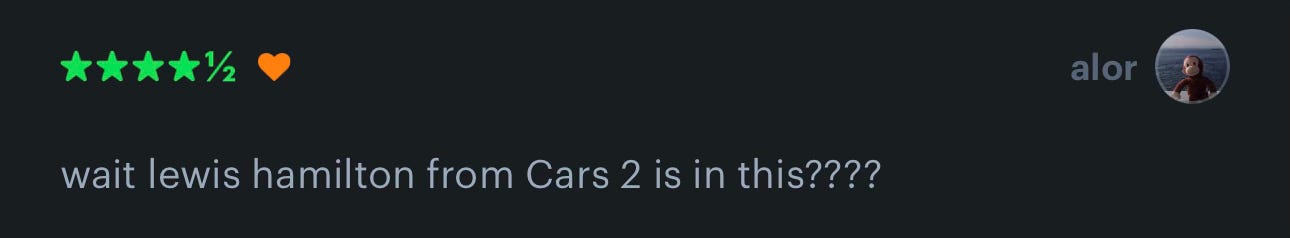 As always, let me know what you thought of F1 and whatever else you’ve been watching.