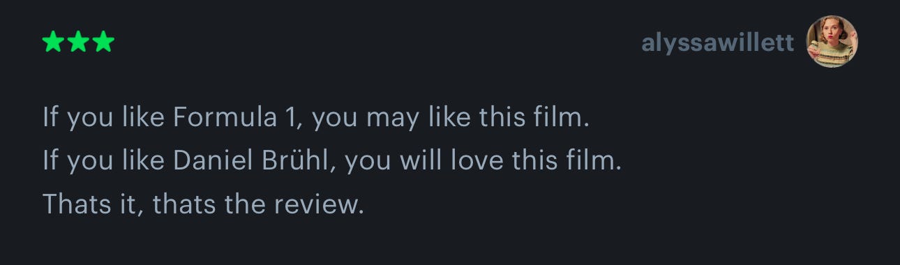 There’s not much in the way of negatives here. I actually loved this movie way more than I thought I would. If you really wanted to level any criticisms at Rush, you could say it follows quite a few of the conventional sports movie tropes like the underdog story, the personal setbacks, the climactic final showdown etc. But this is a sports movie newsletter, and I think it’s safe to say that all of us here are fine with these tropes. While they are still there, I do think that the film presents them in interesting ways, and I was firmly engaged the entire time. Perhaps it helped that I didn’t know much about the real life events too, because there were a few moments in there that really shocked me.